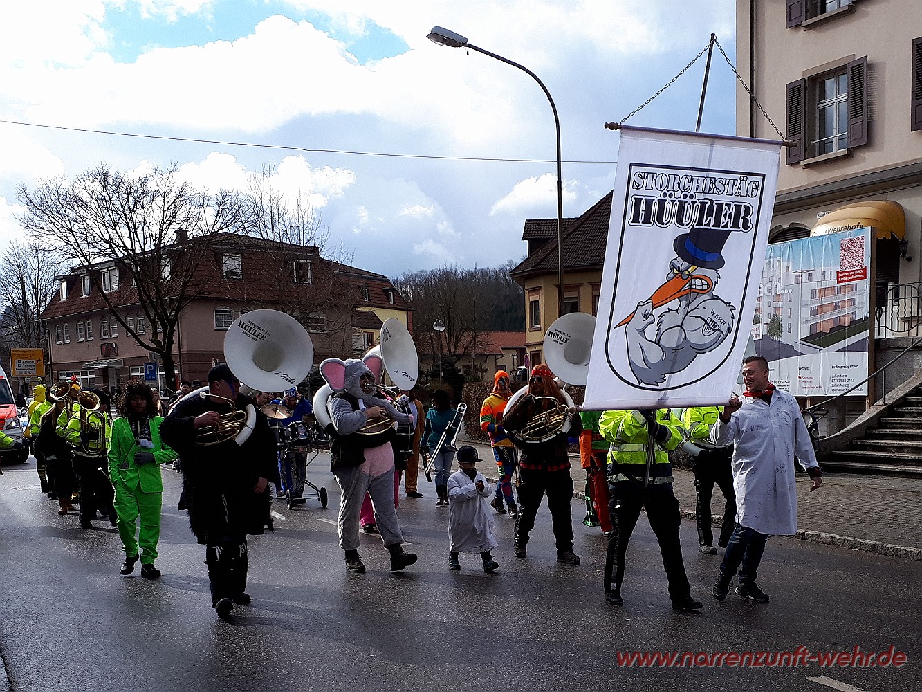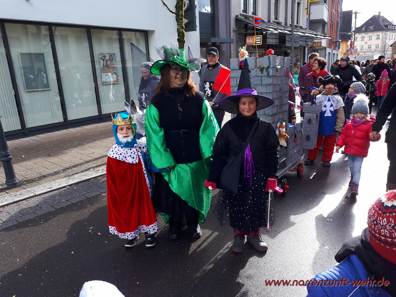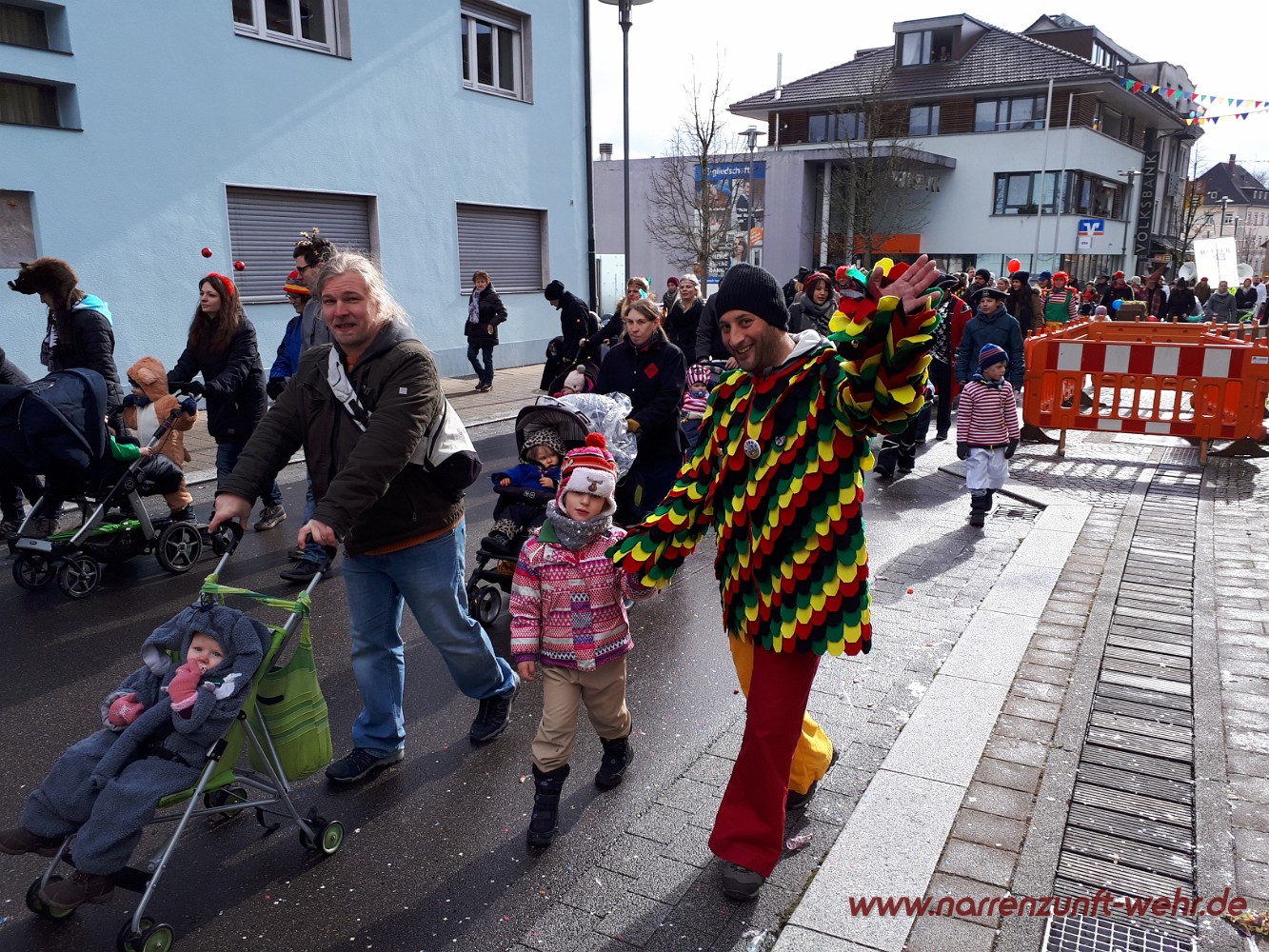 Der Kinderumzug startete kurz nach 12.11 Uhr von der Georg-Kerner-Straße. Begleitet wurde der Umzug von den Lus-Chaibe und den Storchestäghüüler. Unser Weg führte uns durchs Tal, wo wir an der Sparkasse Hochrhein empfangen wurden und die Kinder etwas Süßes zum naschen bekamen. Danach ging es bis zum Radsport Büche / Schmidt's Markt wo die Kinder von der Servicegemeinschaft Wehr nochmals mit einer Süßigkeit bedacht wurden. Wer Lust hatte, durfte sich in den Fasnachtsmändig-Umzug einreihen und mit bis zum Narrenmarkt laufen.